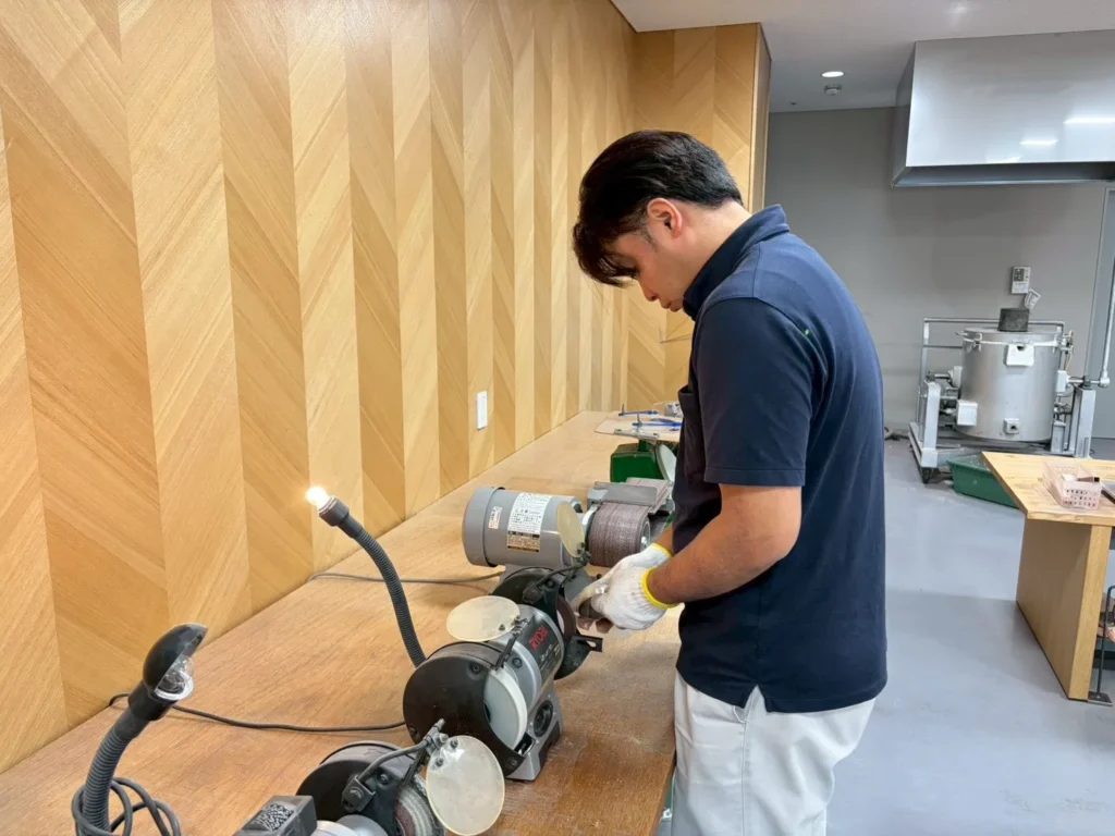 たわしで磨くことで、金属が流れた跡などのムラを馴染ませることができるんです!