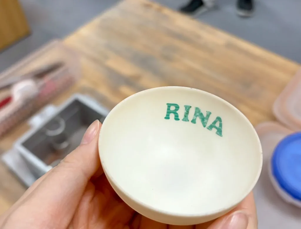 ぐい呑みの完成です♪「RINA」の文字もしっかり綺麗に彫られています!