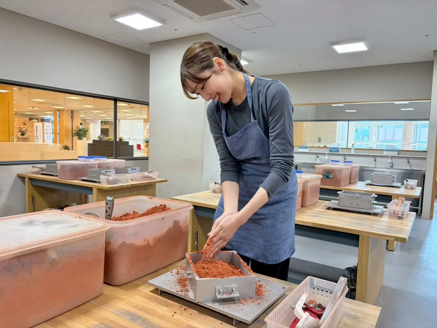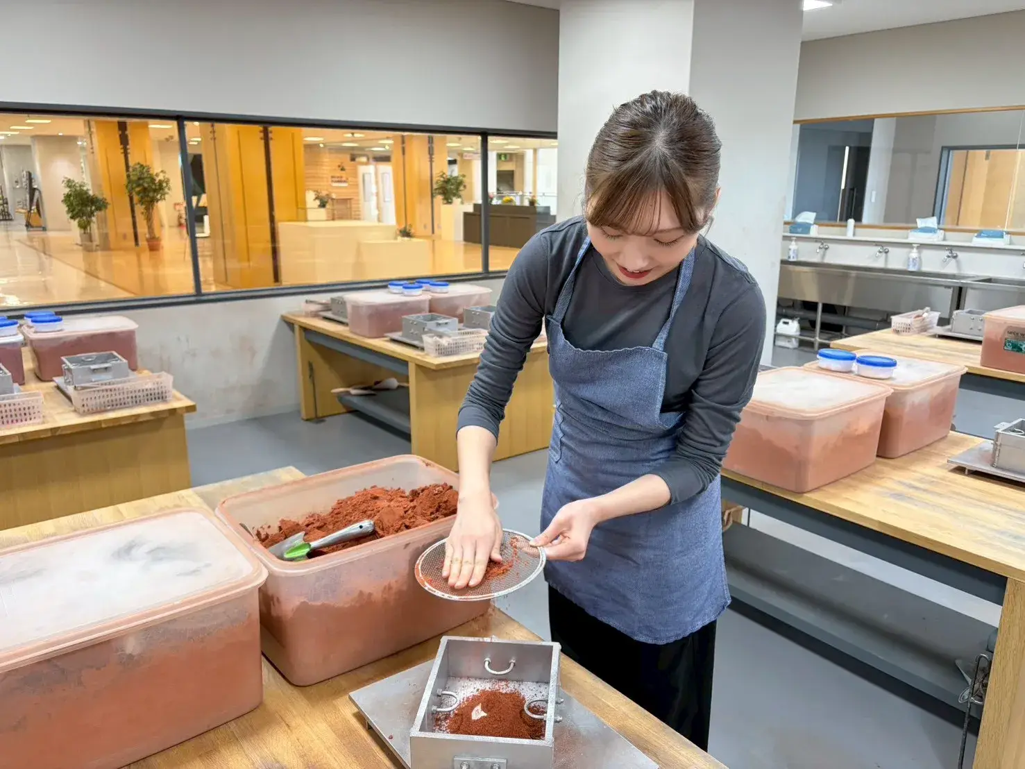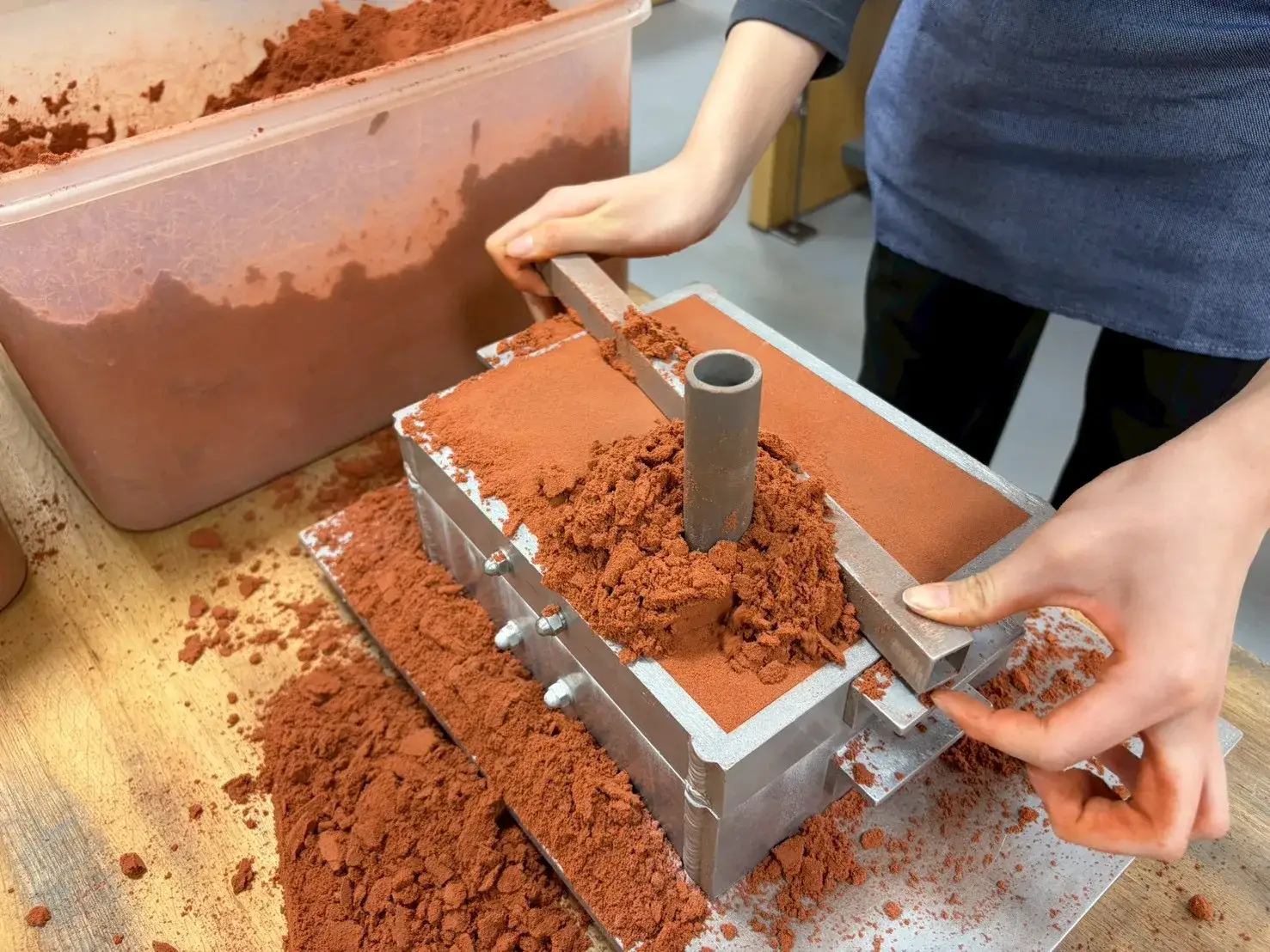 網でこしたり手でほぐしたりしながら、何回にもわけて枠の中に、鋳物砂を入れます。