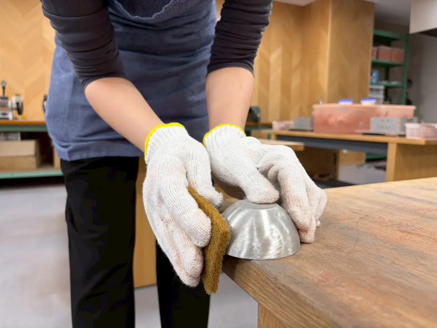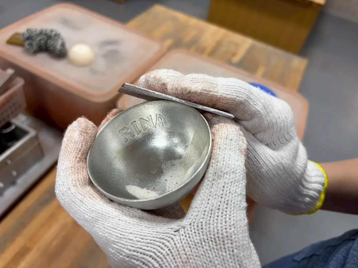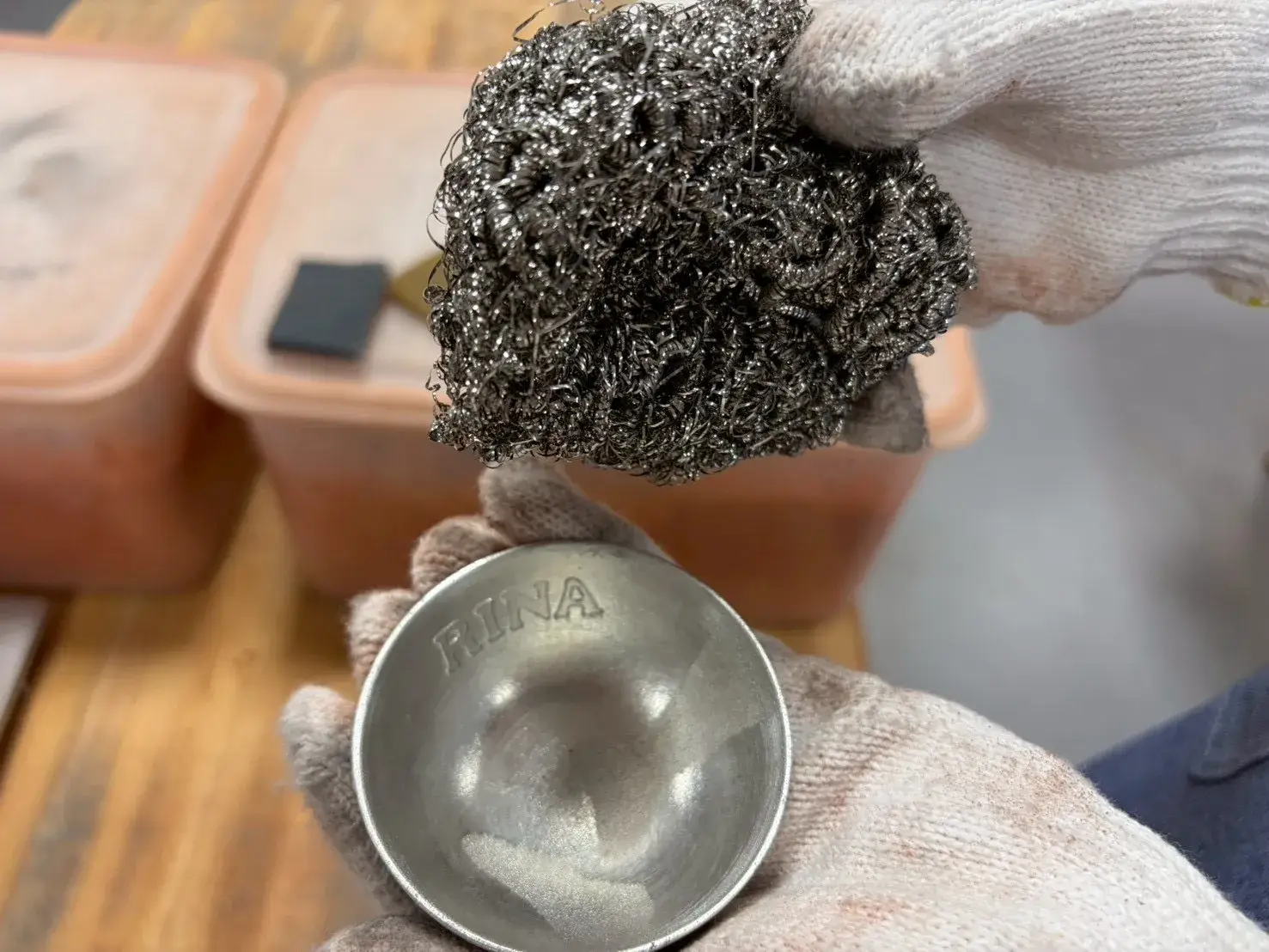 ヤスリとスポンジで器の外側と縁を磨き、内側はたわしで磨き上げます!