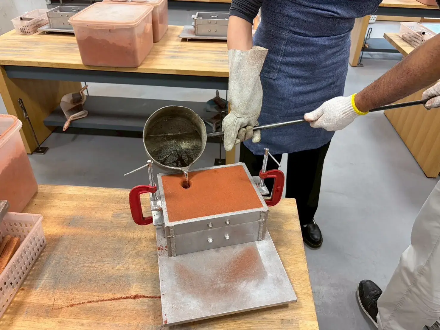 湯口棒で開けた穴から、溶かした錫を流し込みます!錫の温度はなんと280〜300℃!