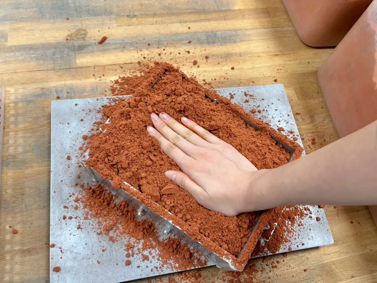 ぎゅーっと体重をかけて鋳物砂を手で押し固めたら…