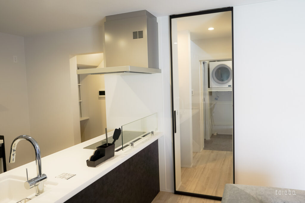 LDKと階段、ユーティリティを仕切るのは、視線が奥まで抜けるスタイリッシュなクリアドア。各箇所の温度を快適に保ちながらも、空間を完全に閉ざさないことで、どこにいても家族の気配を感じられる設計です。