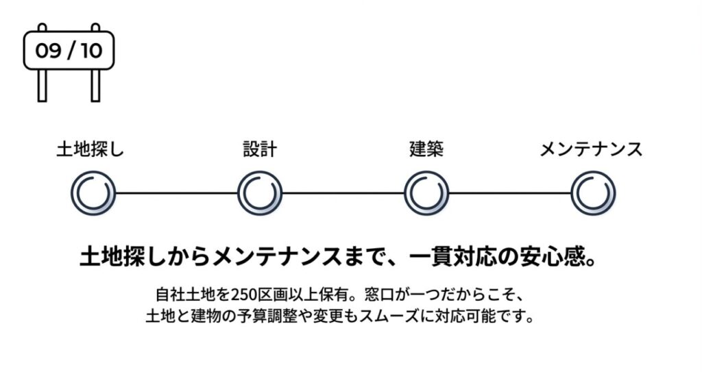 250区画以上の豊富な自社土地、そして建てた後も続く自社アフター体制。