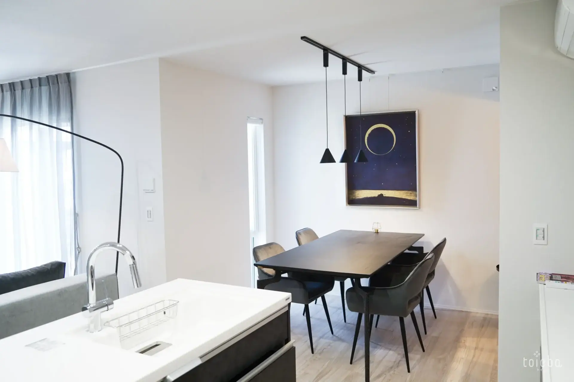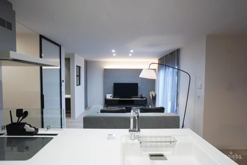 LDKの壁や天井には『白』で広さを出し、一部は『グレー』にして空間を柔らかく見せる。