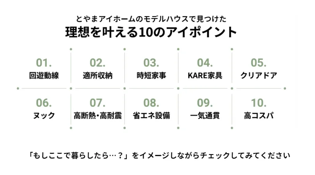 このモデルハウスを訪れたらぜひチェックしてほしい、家づくりのヒントが詰まった「とやまアイホーム・10のアイポイント」をご紹介します!