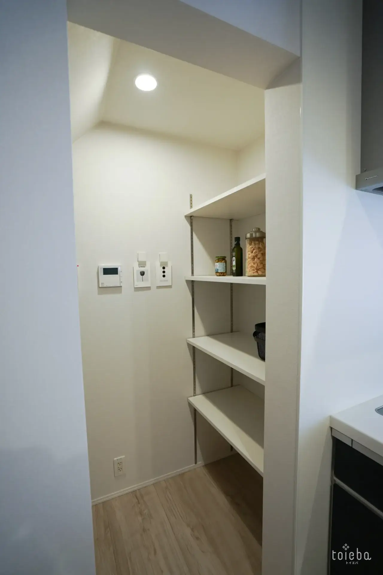 1階には、広い土間収納を起点に、パントリーやキッチンカウンター、脱衣所の棚、さらにはリビング併設のワークスペースにまでキャビネットが備わっています。