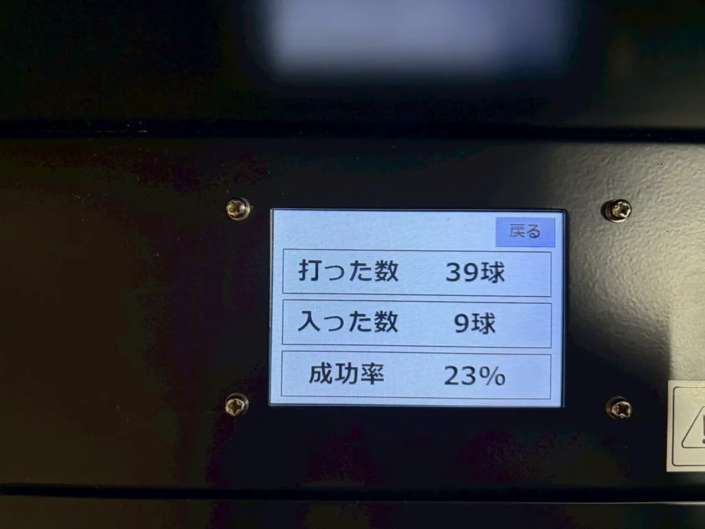 マシンの液晶画面では、シュートの成功率も確認できます!成功率23%…。次はもっと決めるぞ〜!