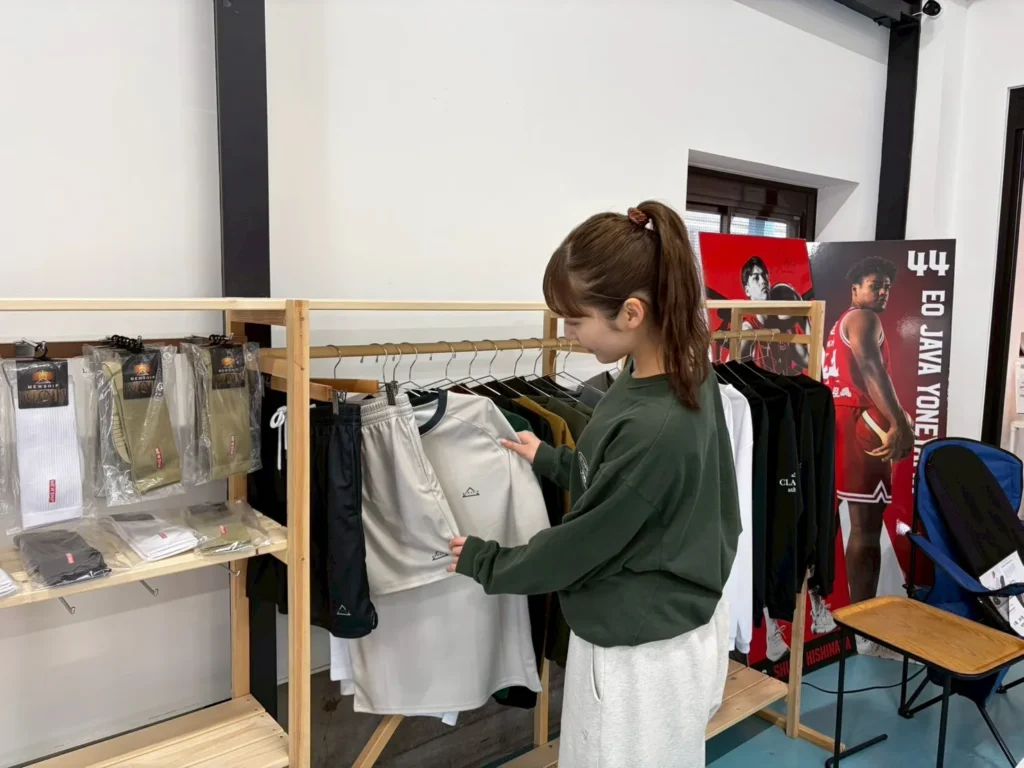 店内奥では、アパレル商品「MEWSHIP」の販売もしています!JAMとのコラボ商品もあるのでチェックしてみてね〜!