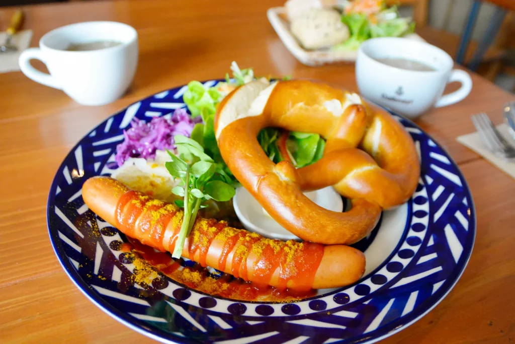 「ドイツ」の名を冠する、家庭料理の代表とも呼べる「ジャーマンプレートランチ」(税込1,738円)は、現地から取り寄せたブルストに、特性のカレー粉とソースを合わせた「カリーブルスト」とプレッツェルのセット。