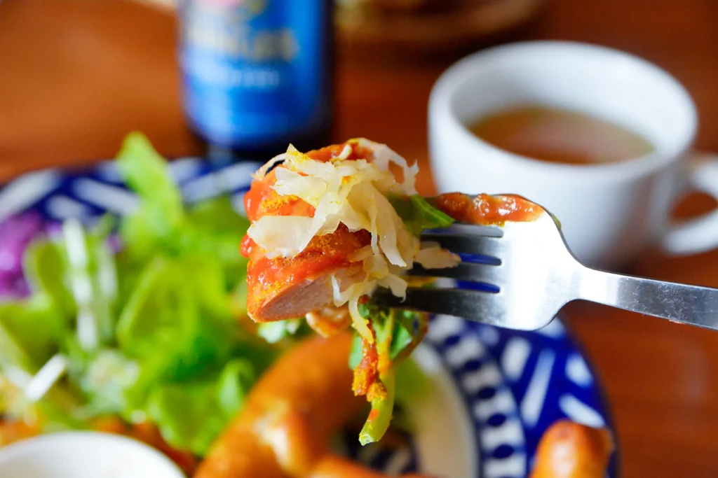 余計なものを混ぜていない純粋なブルストの旨味と、その味を引き立てるソースとスパイスの香りが食欲を掻き立てます。ここでしか楽しめない魅力を、存分に味わえるプレートです。