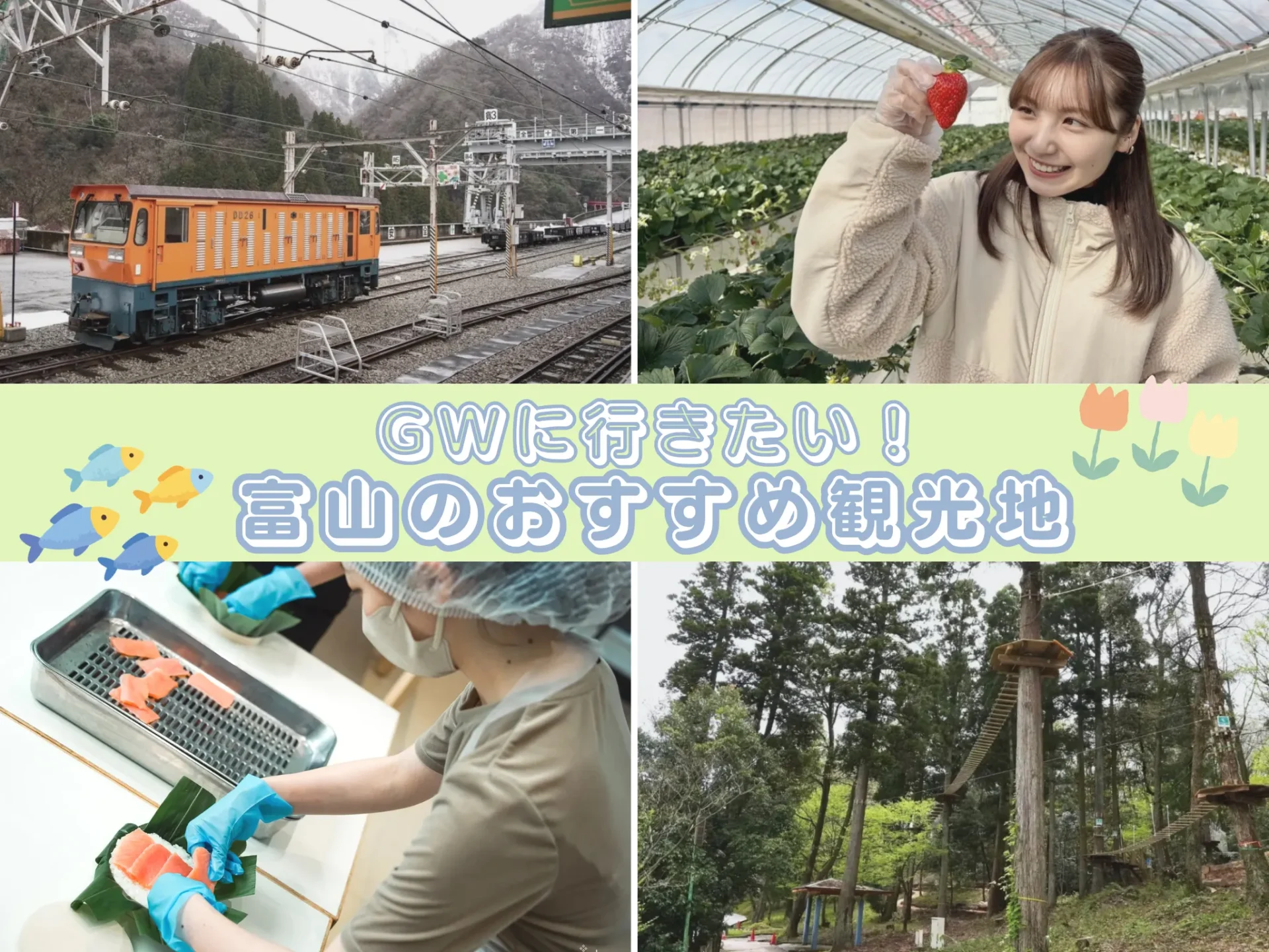 さらに、黒部峡谷トロッコ電車で峡谷の自然を満喫したり、水族館や公園でゆったり過ごしたりと、楽しみ方もさまざま。いちご狩りやますのすし作り体験など、旅の思い出になる体験も充実しています。