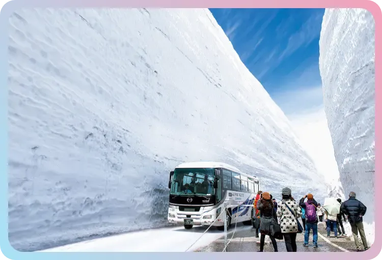 富山のゴールデンウィークを代表するイベントが、立山黒部アルペンルートで開催される「雪の大谷フェスティバル」です。立山黒部アルペンルートは、標高3,000m級の北アルプスを貫き、富山と長野を結ぶ世界有数の山岳観光ルート。春から初夏にかけては巨大な雪の壁が現れ、観光のハイライトとして多くの人が訪れます。