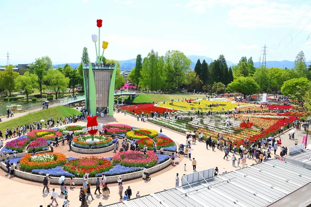 メインスポットは、14品種21万本のチューリップで描かれる「大花壇の地上絵」です。チューリップタワーや文化会館屋上のパノラマテラス、チューリップスカイウォークから見下ろすと、色鮮やかな花のアートが広がります。フォトスポットとして人気の「円形花壇」では、14品種3万4千本のチューリップが咲いており、記念写真にもぴったりです。