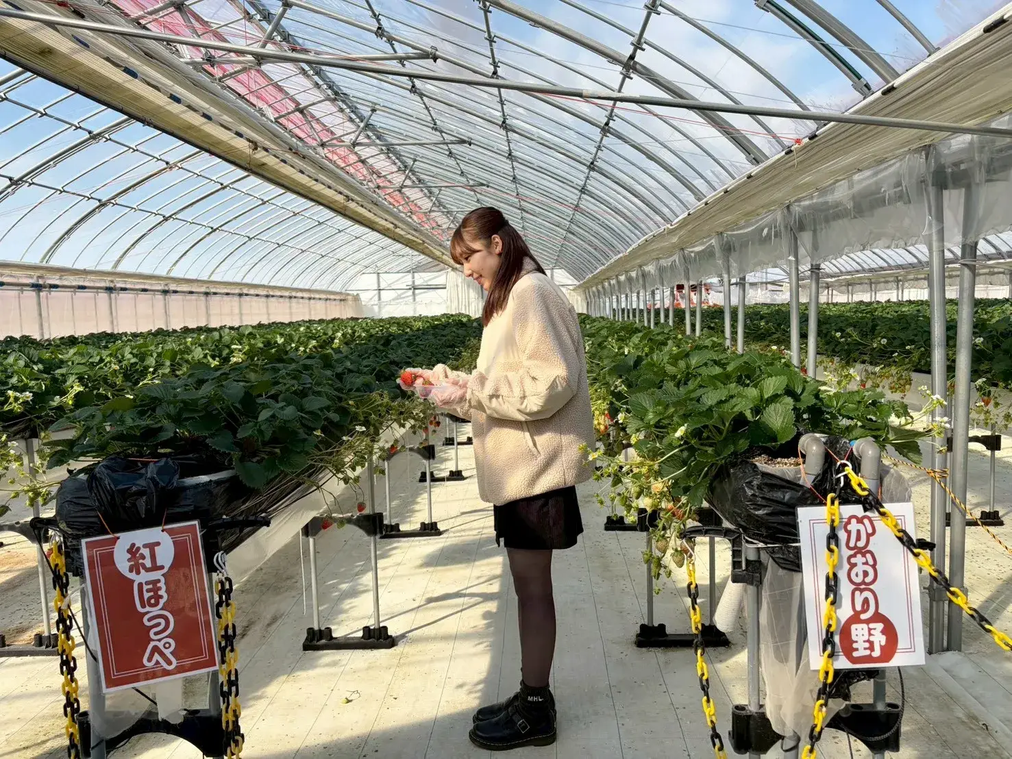 園内では、約17,000株にもおよぶ「紅ほっぺ」と「かおり野」を40分間たっぷり味わえます。紅ほっぺは甘みと酸味のバランスがよく、かおり野はやさしい甘さと香りを楽しみやすい品種です。テーブルや椅子があるため、小さな子どもやご年配の方でも安心です。