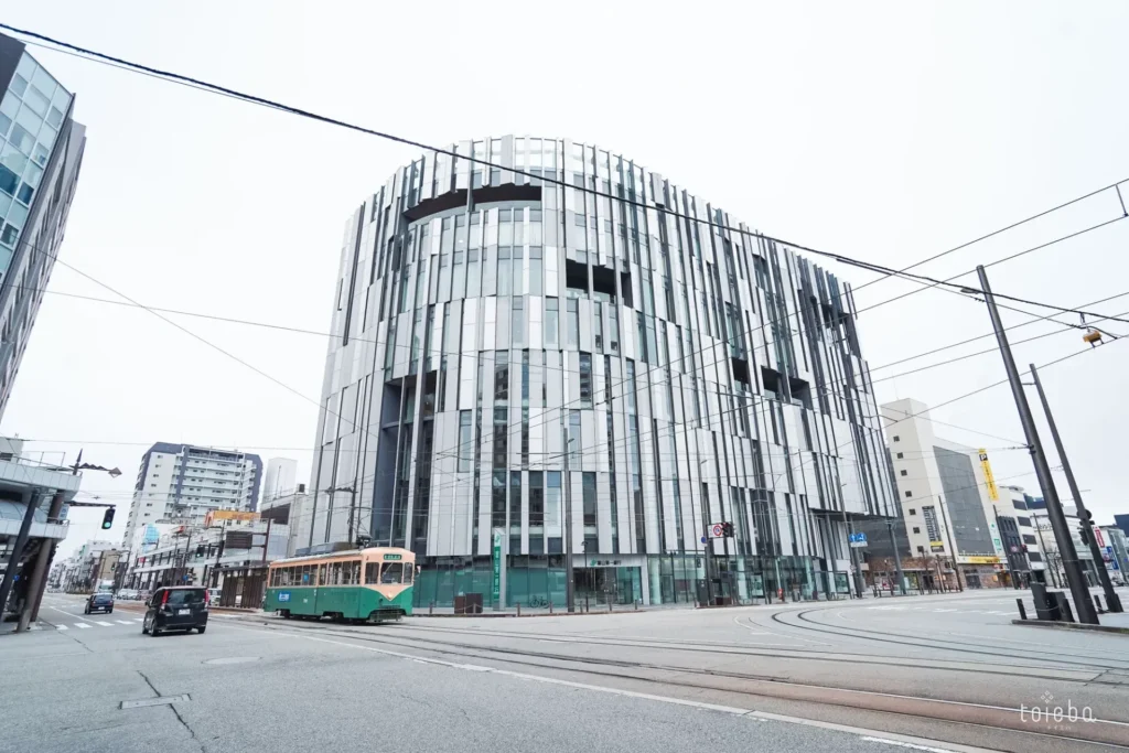 富山駅北口から徒歩15分、環水公園方面へ歩くと大きなガラス張りの外観が目じるしの建物が見えてきます。
