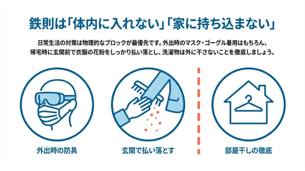 日常生活でできる花粉症対策の基本は、花粉を「体内に入れない」「家の中に持ち込まない」ことです。