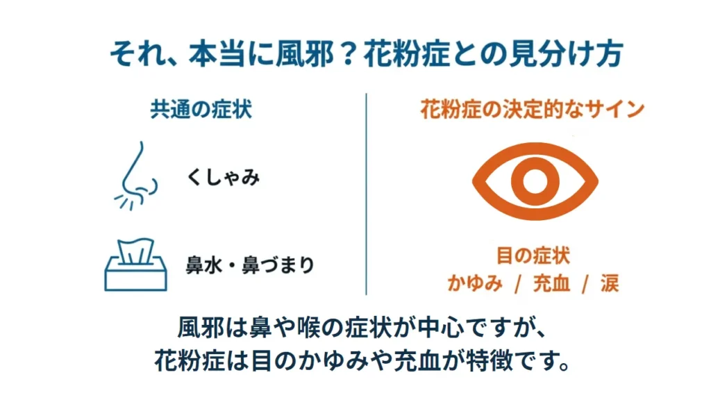 花粉症と一般的なアレルギー性鼻炎や風邪との大きな違いは「目の症状」です。花粉症は、くしゃみ、鼻水、鼻づまりといった鼻の症状に加えて、目のかゆみ、充血、涙(流涙)といったアレルギー性結膜炎を高い頻度で併発します。春先に鼻の症状だけでなく、目の症状もあれば花粉症を強く疑います。