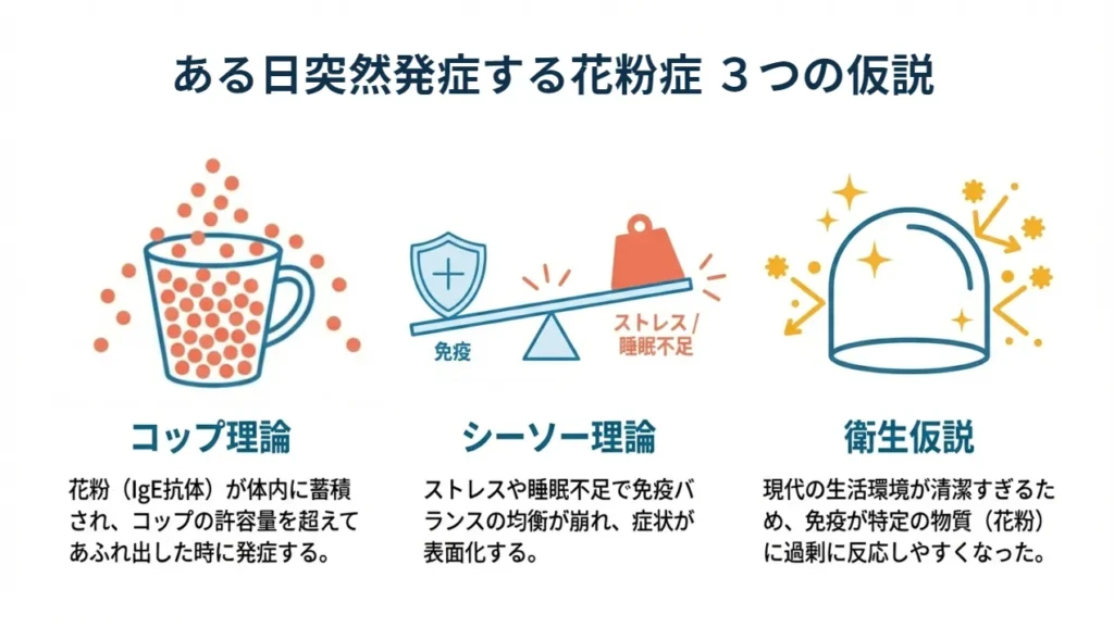 ストレスや睡眠不足などで体の免疫バランスが崩れると、アレルギー症状が表面化するという説です。体調が悪い時に症状が出やすいのはこのためかもしれません。