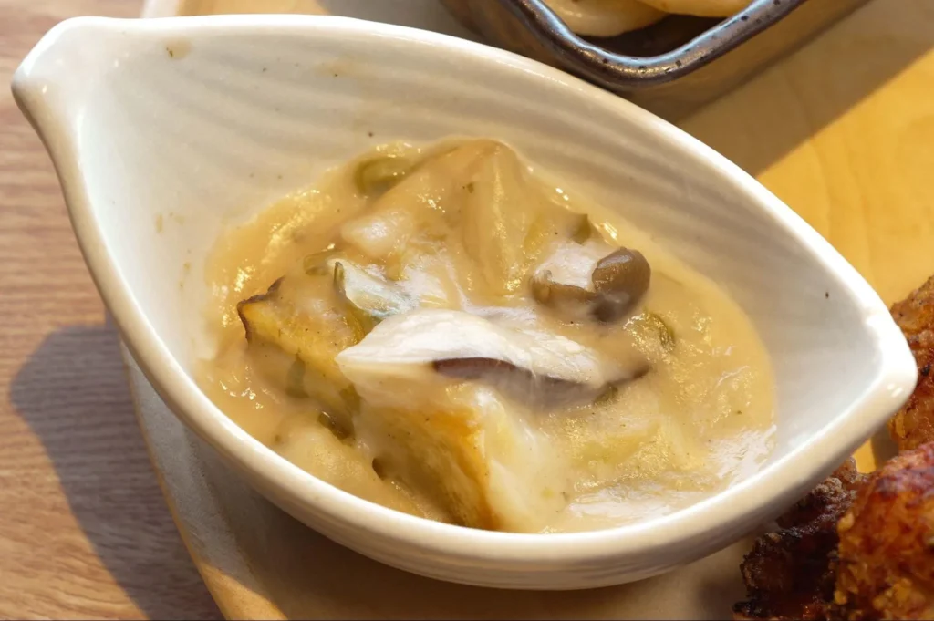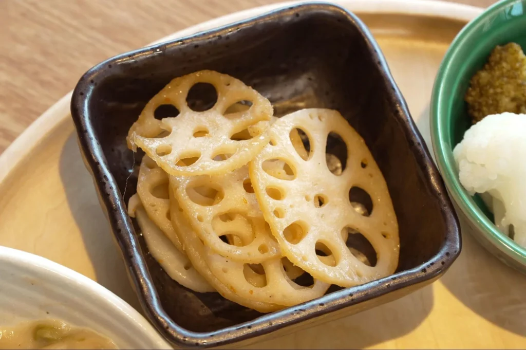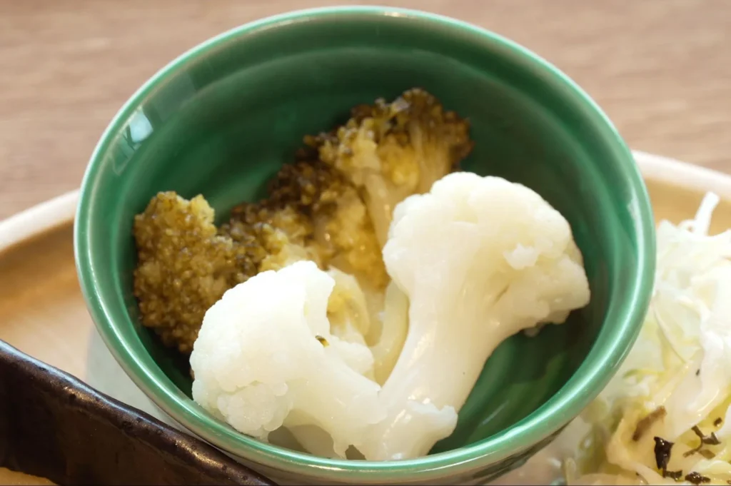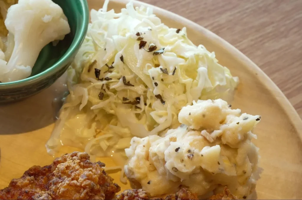 この日の副菜は、白菜やさつまいもなどを入れた鶏のクリーム煮、レンコンのきんぴら、ブロッコリーとカリフラワーのピクルス、大豆とコーンのポテトサラダ、ドレッシングで和えたキャベツの千切り。