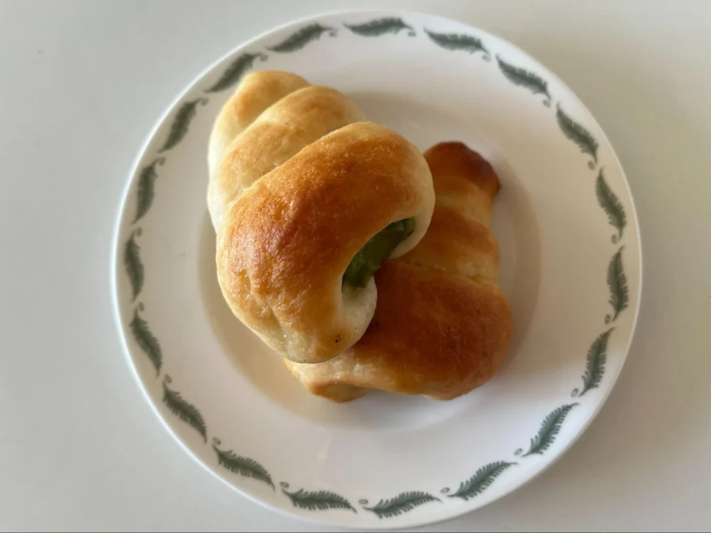 こんがりと焼けたフォルムが愛らしいコロネ。コロネはとがった先から食べる派の私。口に運べば、ふんわりモチモチやさしい甘さがひろがるパンの味!