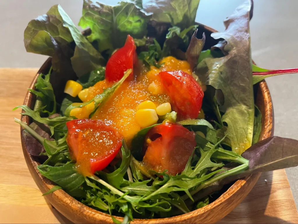 サラダに添えられるのは、酸味をおさえたニンジンとタマネギのドレッシング。