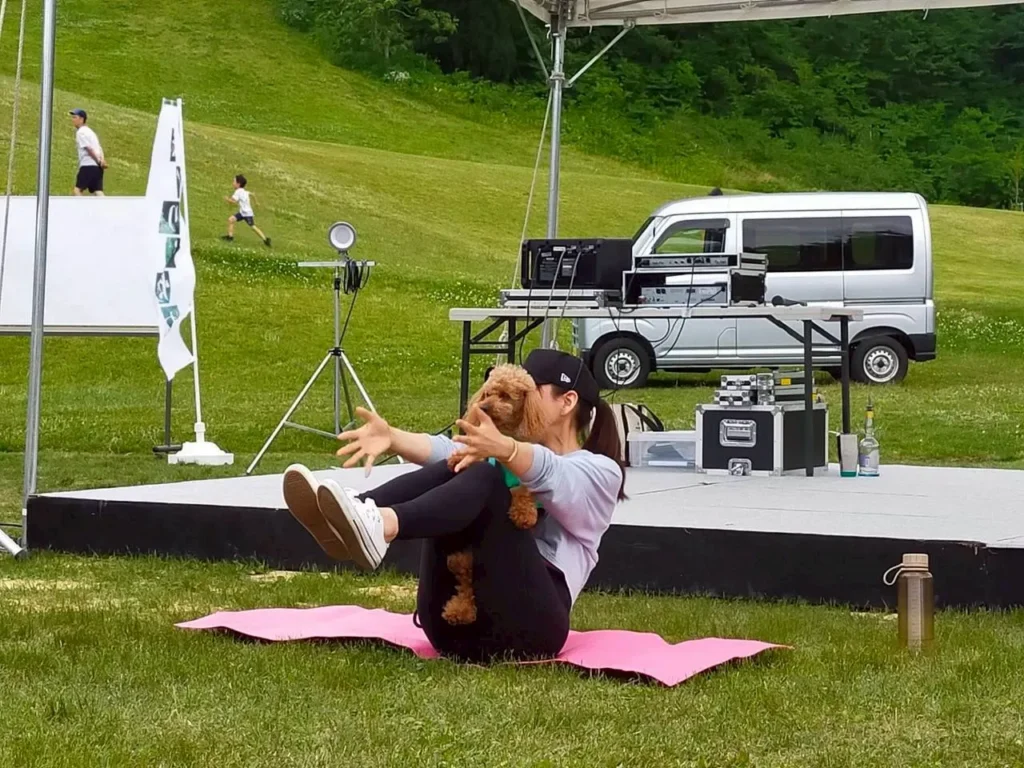 トイプードルの愛犬スマイルちゃんと一緒に、ドッグヨガのイベントも開催。yoko先生のやさしい声に導かれながら、ヨガ初心者でも安心して身体を動かせます。