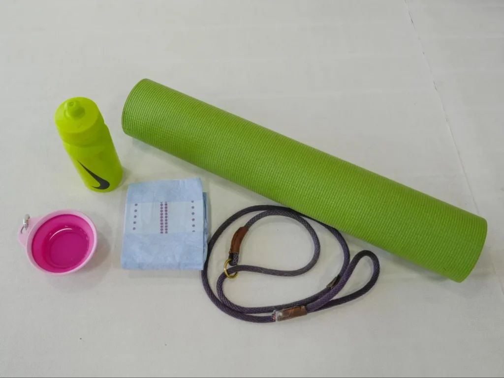 ドッグヨガの持ち物は、ヨガマットに加えて飲み物、長すぎないリードや、愛犬が水分補給しやすいように水飲みアイテム、ウンチ袋など。室内の場合はマナーパンツを着用するのか、確認しましょう。