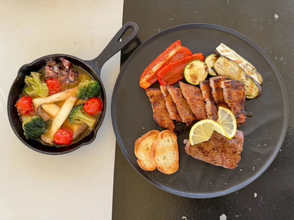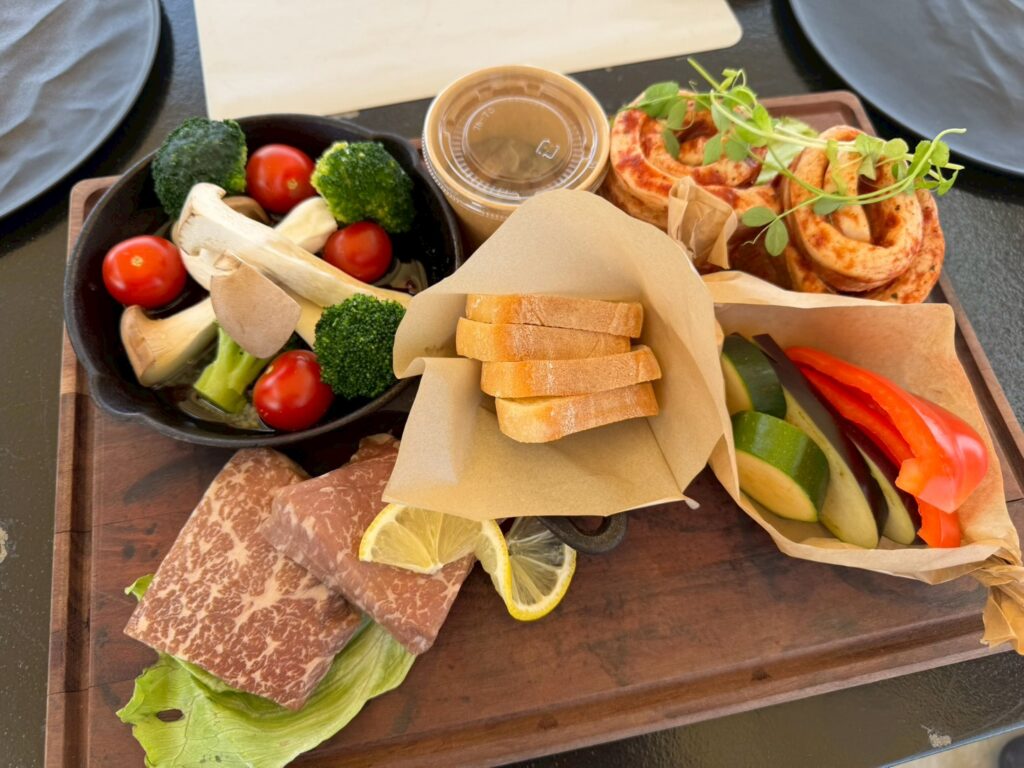 今回は、国産和牛モモステーキ・富山県産豚バラ ケイジャントマトソース・富山湾産ホタルイカと野菜のアヒージョ・季節の焼き野菜4種・バケットをいただきます!どれも美味しそうで、食欲がそそられます…!