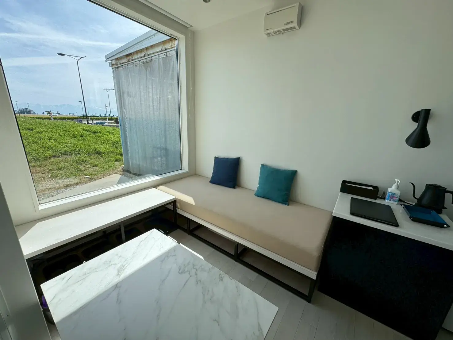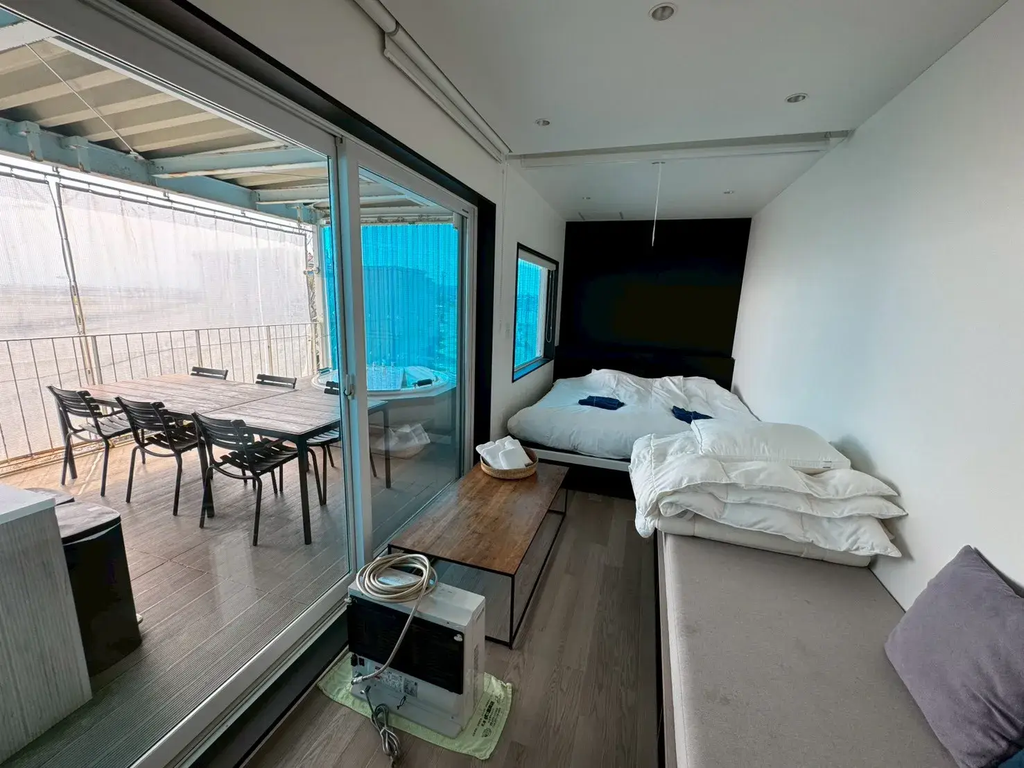 「オーシャンスタンダード」「オーシャンスタンダード with dog」は富山湾を一望できるテラスがついた2階建てのコンテナヴィラ!外には専用駐車場もあり、愛犬と一緒に泊まれるお部屋も◎