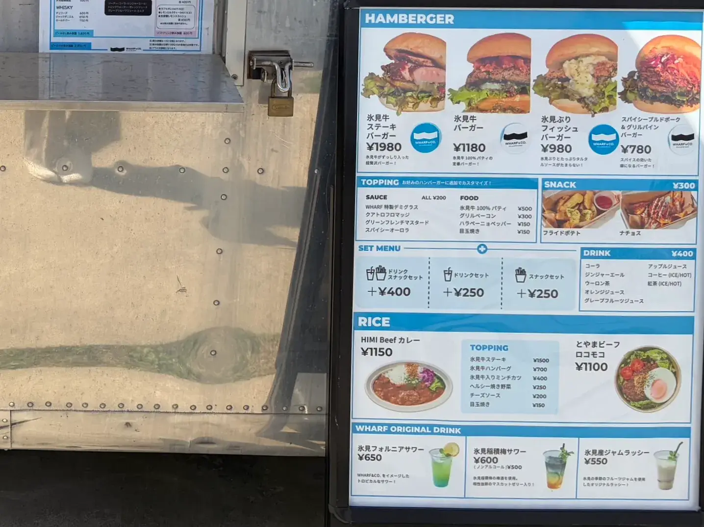 また、BBQエリアのキッチンカーではテイクアウトメニューの販売も!「氷見牛ステーキハンバーガー」や「氷見ぶりフィッシュバーガー」など、地元の食材を使ったメニューがたくさんありますよ♪BBQしながら食べるのはもちろん、ドライブの合間に立ち寄るのもおすすめです!