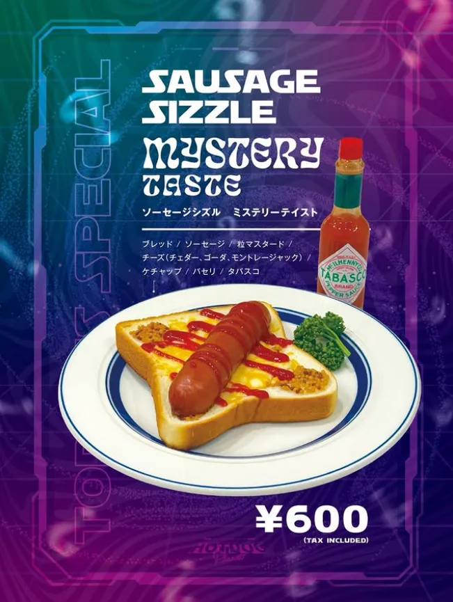 平日の忙しい昼も、週末のゆったりとした朝も楽しめるソーセージシズルはプラス100円で3種のチーズと自家製マスタードを挟んだミステリーテイストに変更できます。