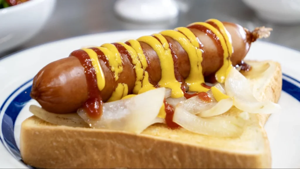 食パンでソーセージを挟むように持ち、角からガブリと頬張れば、ソーセージから溢れ出す肉汁と、香ばしいタマネギの風味が口いっぱいに広がります。