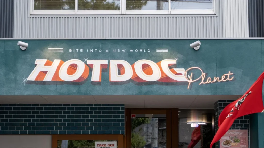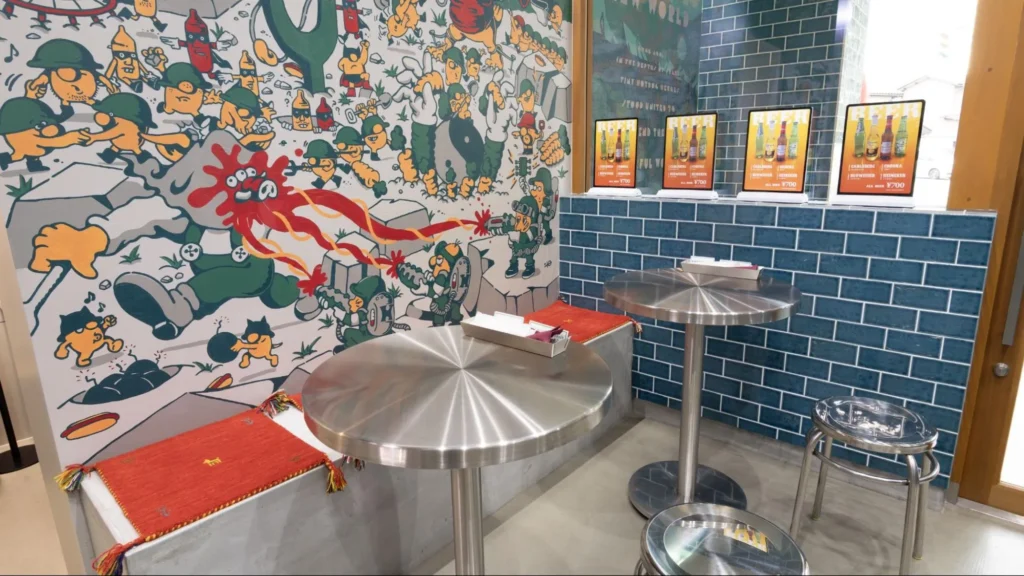 さらに店内も鮮やかなターコイズのタイルと、映画館のスクリーンサイズに広がるアートが描かれています。これはHOTDOG Planetの店名にちなんで、「ホットドッグ星人が支配する謎の惑星」を舞台にしたストーリーになっています。