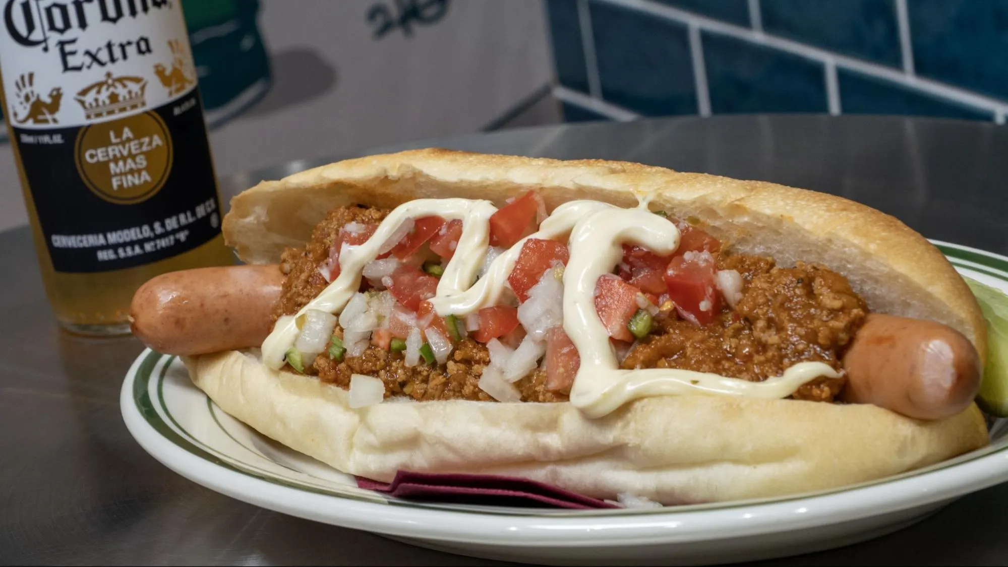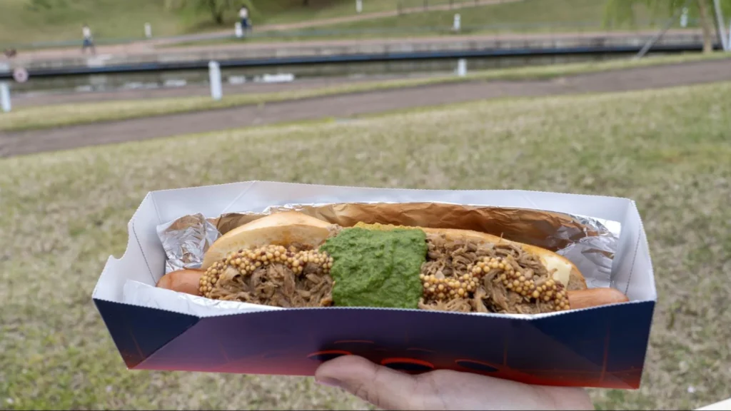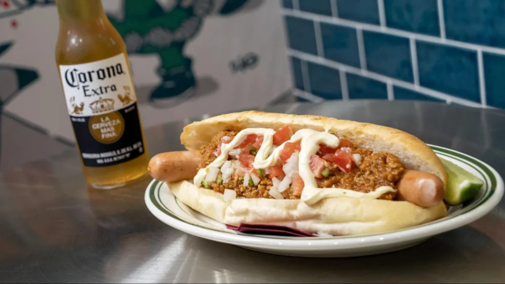 しっかりとした辛みとゴロっとした肉の食感がわかる溢れんばかりのチリミートに、自家製のサルサソース、ガーリックとマヨネーズを合わせたアイオリソース、具材をしっかりと受け止めるのは、もっちりとしたドッグパン。