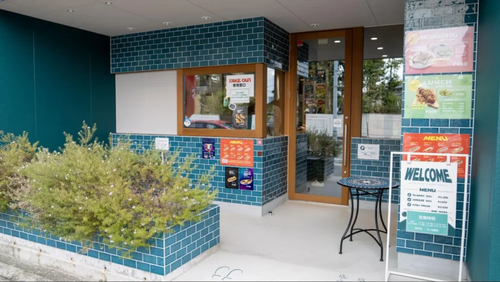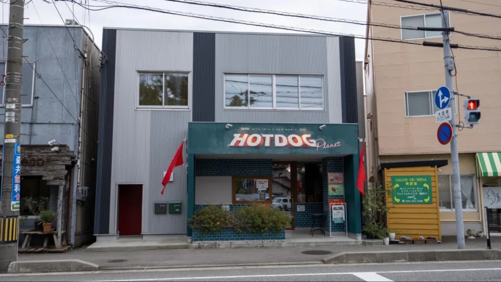 HOTDOG Planetは、富山市の湊入船町の交差点そばにあり、ターコイズの壁に大きく描かれた店名、風にたなびく赤いフラッグが目を引きます。