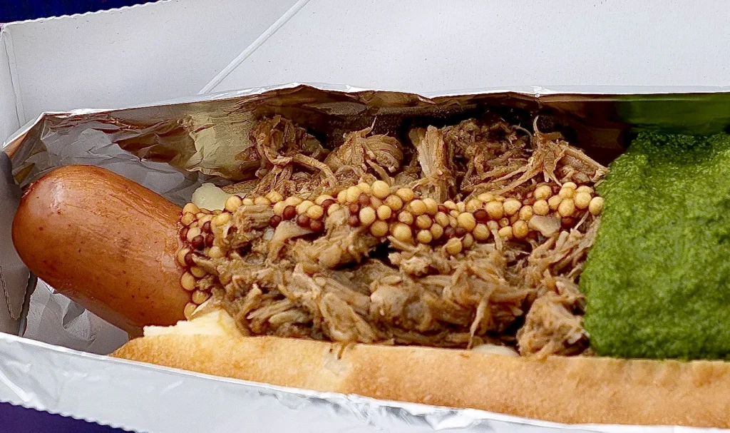両手でしっかりと持ち、大きく一口…ふわっとやわらかいパンの食感と共にソーセージの皮がはじけて肉汁が口の中に広がり、同時にプルドポークのうまみ、マッシュポテトのまろやかさ、マスタードのスパイシーさ、それぞれに個性がありながらも絶妙に調和して口の中を幸せにしてくれます!