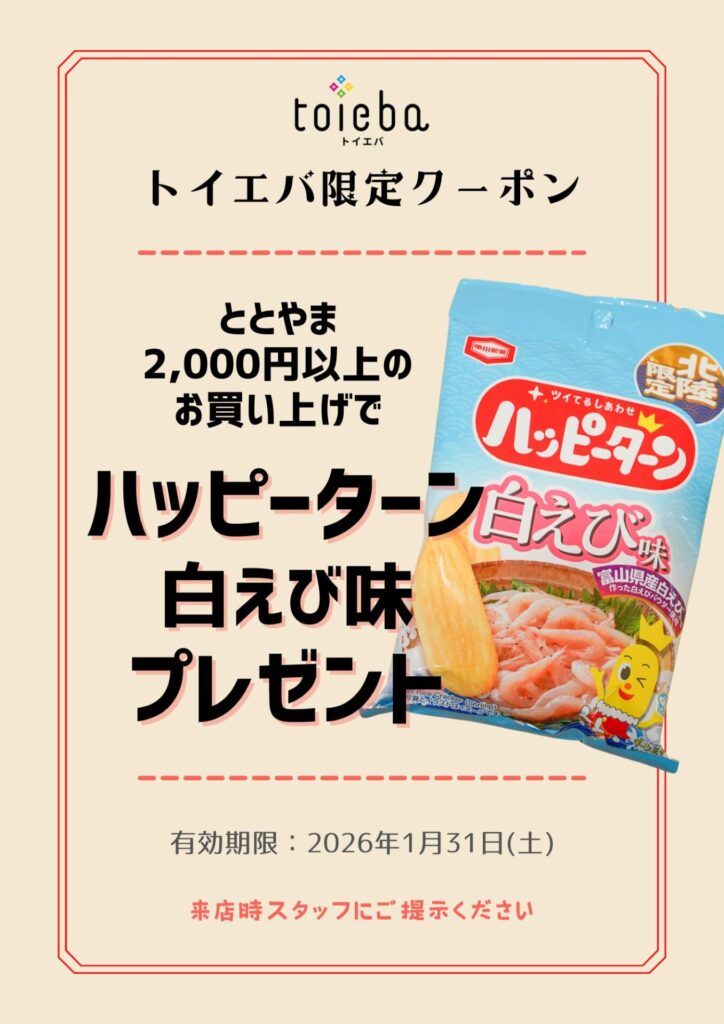 - 2,000円以上のお買い上げで「ハッピーターン(白えび味)」をプレゼントいたします
